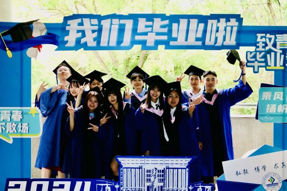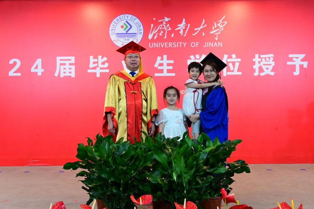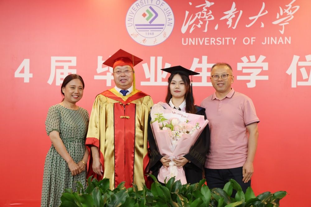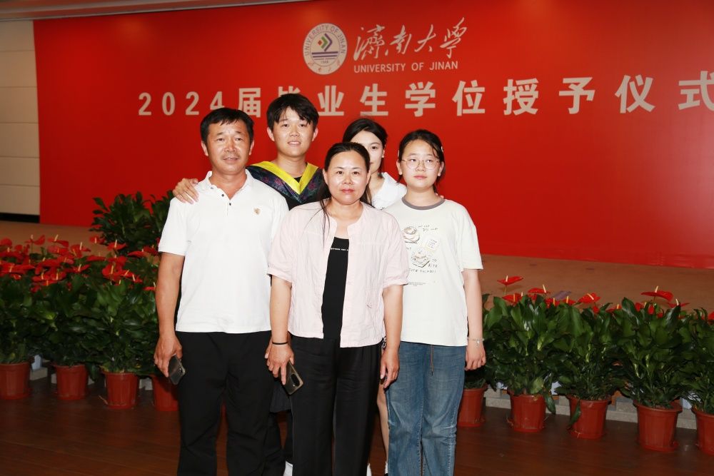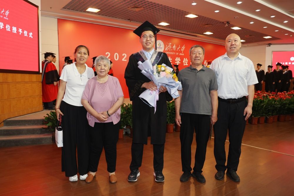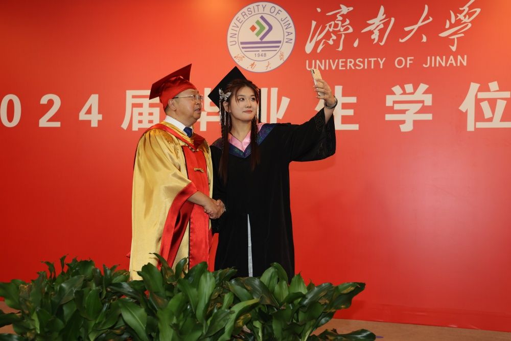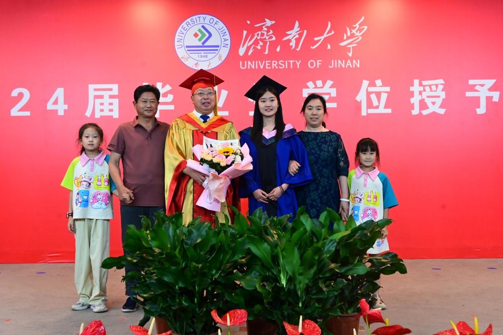 “3、2、1,看镜头”,将身影嵌入照片,将青春定格于此,写不尽的青春,装满道不尽的温情。毕业学子有的手捧花束,面向镜头,绽放最灵动生气的姿态;有的彼此拥抱,彼此祝贺,笑语相迎,泪眼以待,歌颂友谊地久天长;有的在亲属、好友的陪伴下,享受双倍幸福的温馨时刻,共同见证这场专属的人生片段。主席台上的深鞠一躬、深情握手,表达对授业恩师最真挚的谢意;老师为学生正衣冠,表达对毕业学子最殷切的关爱;父母满怀期盼的目光,表达对毕业学子发自内心的欣慰与自豪。曾记否,甲子湖的水光潋滟,滋兰苑的草木葳蕤,教学楼、图书馆、宿舍楼的鳞次栉比,这些青春光影将永存为美丽的风景。无论未来同学们去往何方,请不要忘记曾拂过耳畔的每一缕风,不要忘记曾绽放颊边的每一个微笑,不要忘记曾共同欢唱的每一首歌。你们是济大最美的遇见,济大是你们永远的港湾,欢迎大家常回家看看!