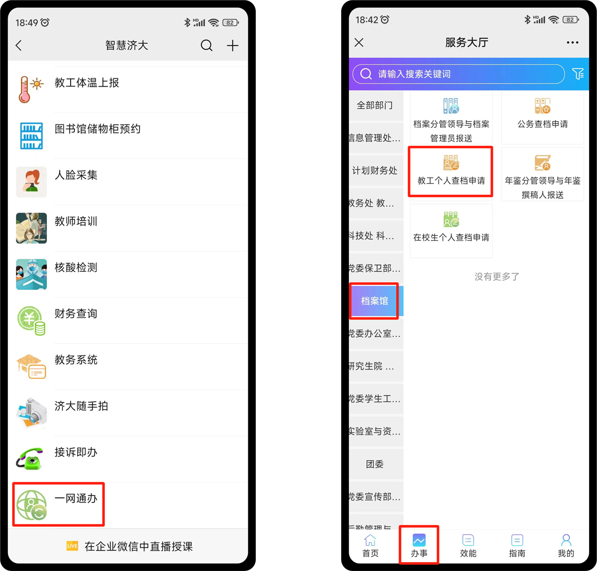 移动端:微信登录智慧济大企业号→一网通办→办事→档案馆→教工个人查档申请,填写申请信息。